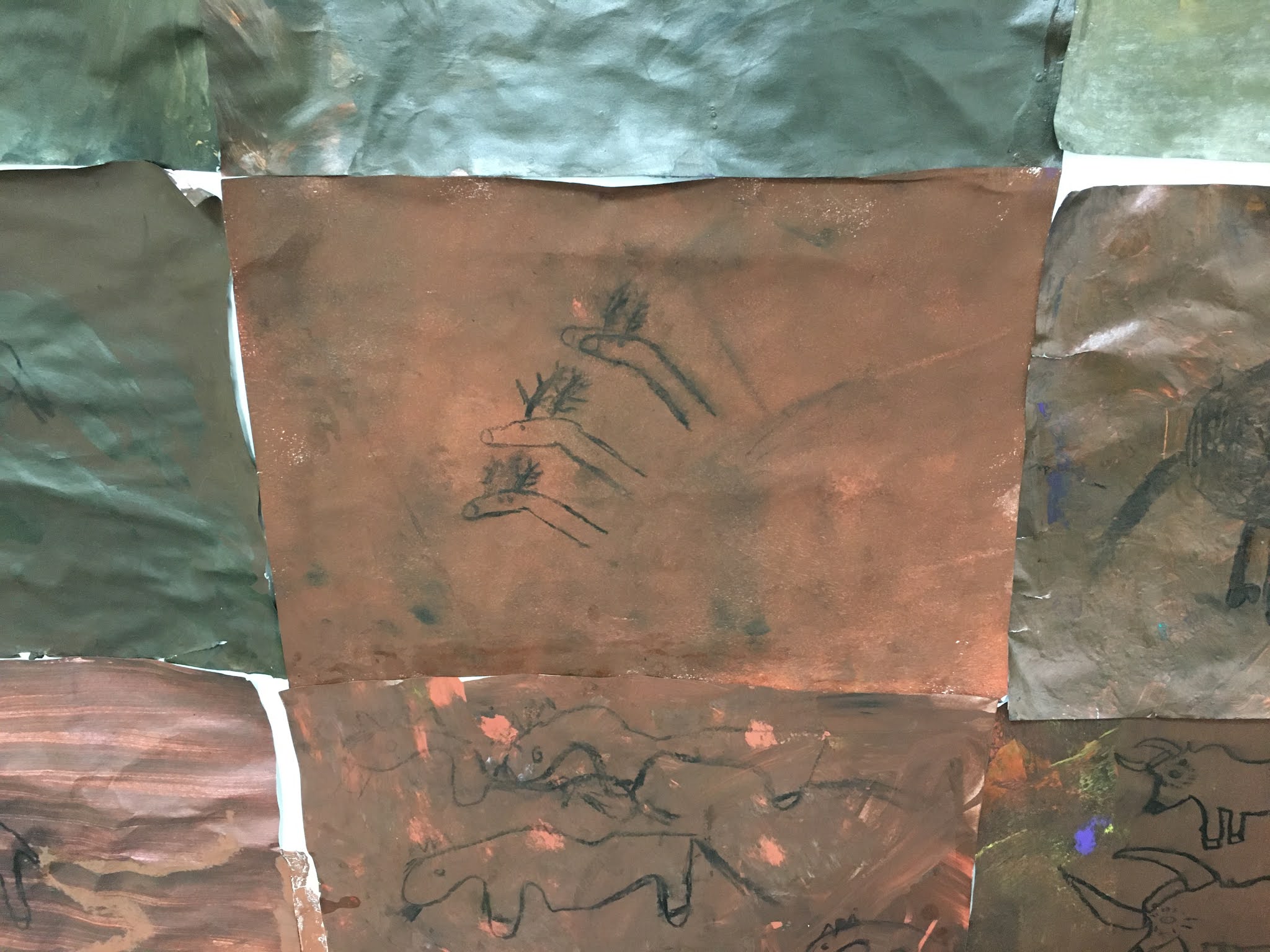 Les élèves se sont essayés à l'art préhistorique : représentation des animaux dessinés à la préhistoire (cerfs, taureaux, chevaux...), peintures au doigt et empreintes de mains positives et négatives.